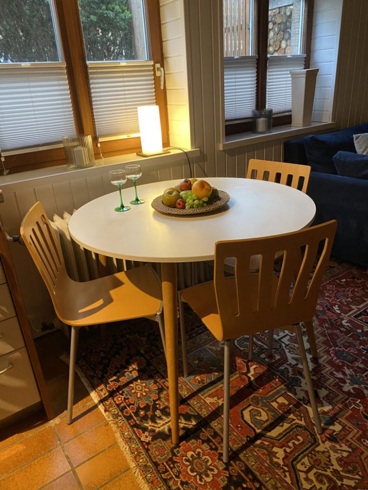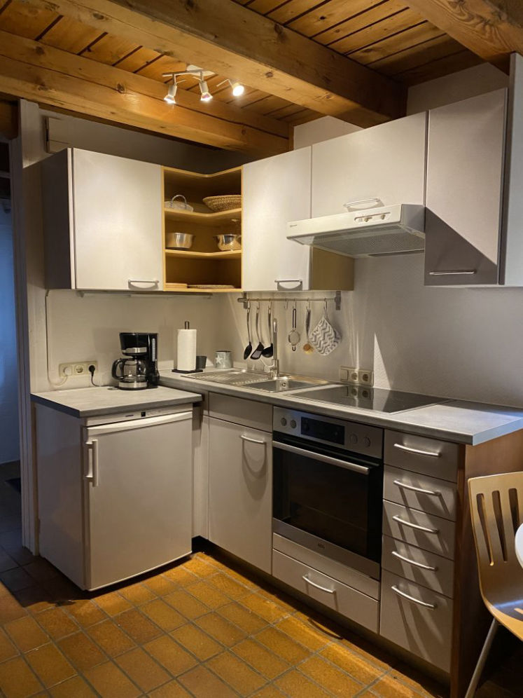 Diese Wohnung verfügt über eine voll ausgestattete Küche mit Kühlschrank, Backofen, Cerankochfeld, Wasserkocher, Kaffeemaschine, Toaster, Mixer, Eierkocher sowie Geschirr, Gläsern und Besteck für 6 Personen.