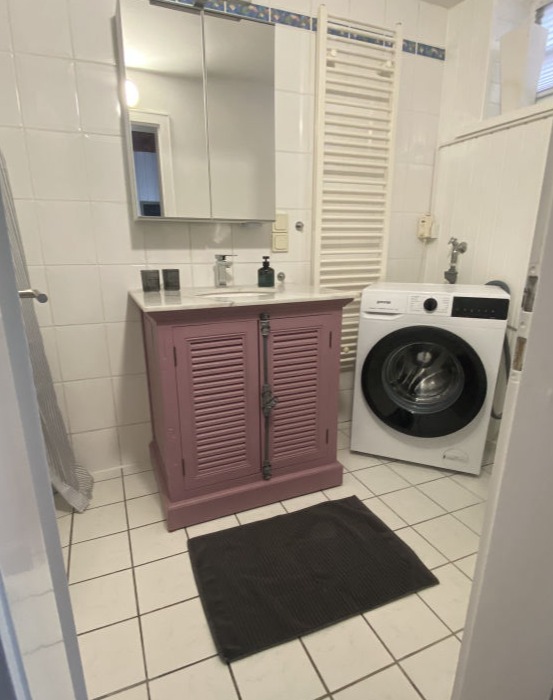 Im Bad finden Sie eine Personenwaage, Föhn und eine Waschmaschine und Wäscheständer.