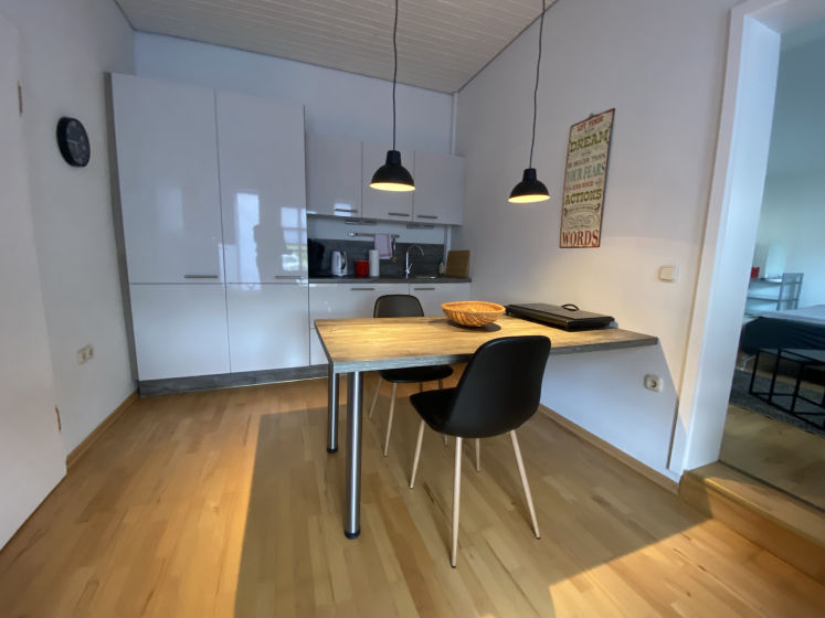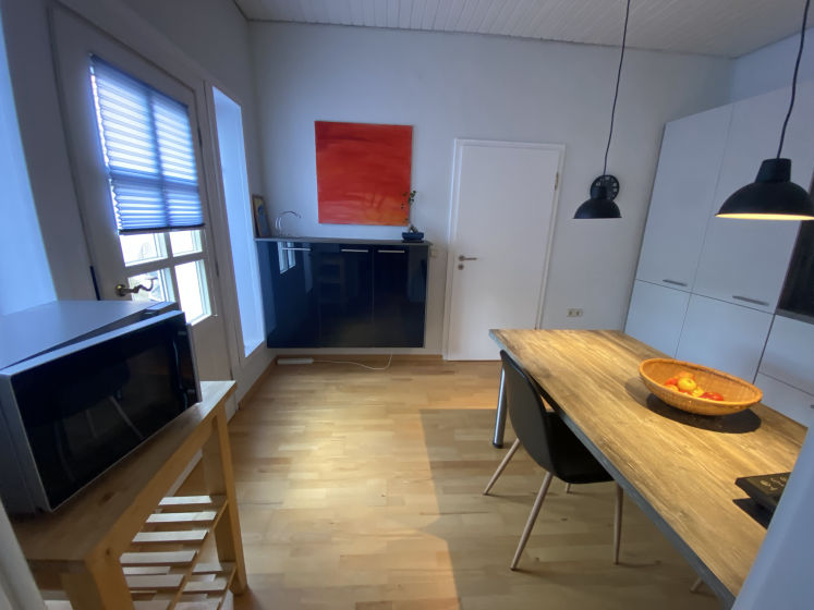 Die Küche ist voll ausgestattet mit Kühlschrank, Microwelle, Induktionskochfeld, Wasserkocher, Kaffeemaschine, Toaster, Mixer, Eierkocher sowie Geschirr, Gläsern und Besteck für 4 Personen.